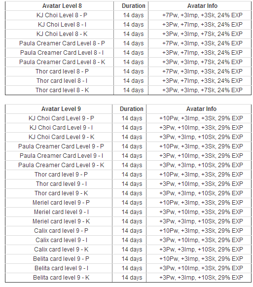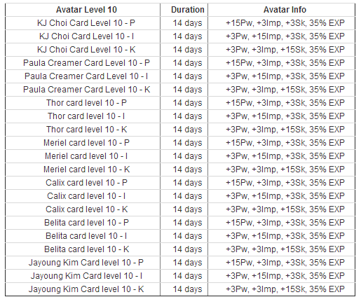 I know a lot of players have been asking about making the avatars more available to the public, and now you can with the brand new Avatar Book II In this box, we will also be having the brand new Ja Young Kim Avatar as well! ![]() Along with the new Ja Young Kim card, you will see the many others that you can get your hands on! >>AVATARS<< ![]() ![]() >> Avatar Extension Ticket << Avatar Extension Ticket (7days) : Extend avatar's remain time (7days) Avatar Extension Ticket (14days) : Extend avatar's remain time (14days) Sale starting on 11/05/2012 at 11:00AM (11:00:00 server time) Sale ending on 11/07/2012 at 4:00PM (16:00:00 server time) **Click here for 1x Avatar Book II**![]() **Click here for 3x Avatar Book II**![]() Thanks, Shot Online Team