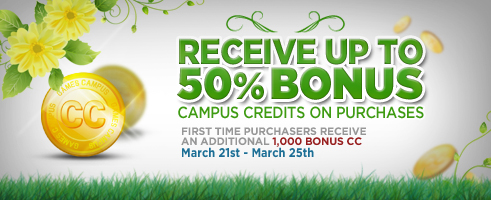 Get some now and receive up to 50% bonus CC on your Campus Credit fill up*! Plus, first time purchasers will receive an additional 1,000 CC on top of their purchase**!